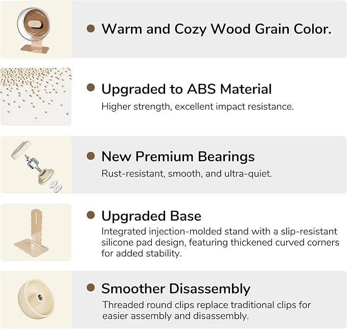 - New Premium Bearings: Our exercise wheel features high-precision bearings that ensure smooth, quiet, and durable performance. These advanced bearings help reduce noise and enhance the wheel's stability, providing a better exercise experience for your pet