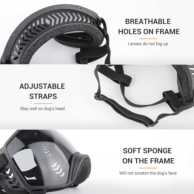 - Use the ultrahard polycarbonate lenses and soft TPU frame, skin-friendly, keep protection for your dog eyes with our transparent lens goggles.