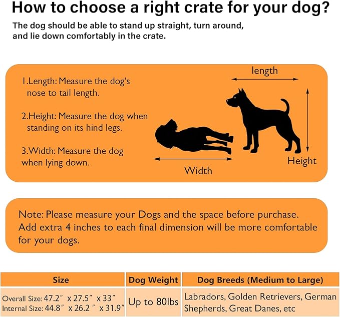 - 【Spacious Interior】 Overall dimensions is 47.2"W x 27.5"D x 33"H. This large dog crate offers ample room for large breeds to stand, turn around, and lie down comfortably. Note: Measure your dog and the space where the dog cage is to locate before purchasing.