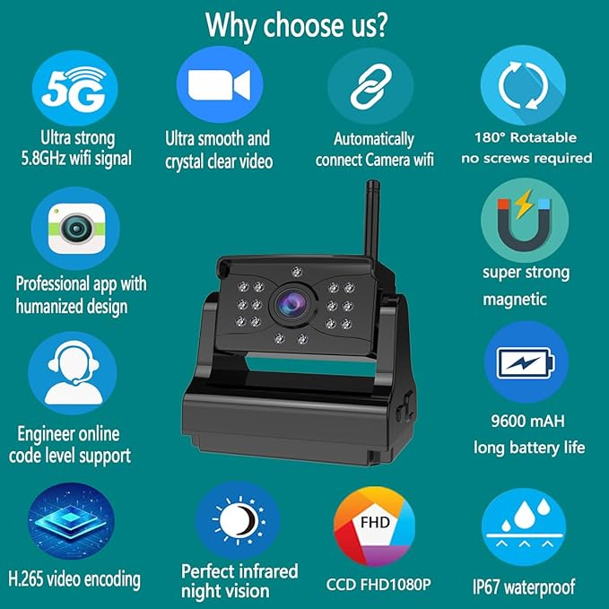 - ✅《Super Strong Wifi Signal》Unlike other trailer backup camera that use 2.4G wifi, Our trailer backup camera has built-in advanced 5G WiFi chip, with reliable anti-interference circuit design to achieve a super strong wifi signal, the stable transmission distance up to 150ft in open area