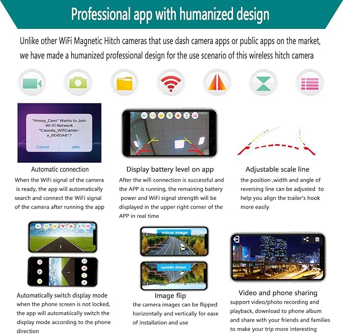 - ✅《Professional app with humanized design》Unlike other trailer camera that use dash camera apps or public apps on the market, we have made a humanized professional design for the use scenario of this magnetic backup camera, For example, We have added features such as wifi automatic connection, real-time display of battery power, automatic switching of display mode, and adjustable reversing scale line etc.