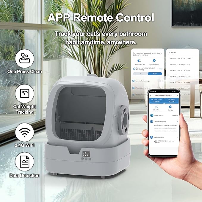 - 📲 Smartphone Connectivity: Supports 2.4GHz Wi-Fi and Bluetooth for smooth connection with the companion app. Easily track your cat’s weight, toilet duration, and litter box visits in real time.