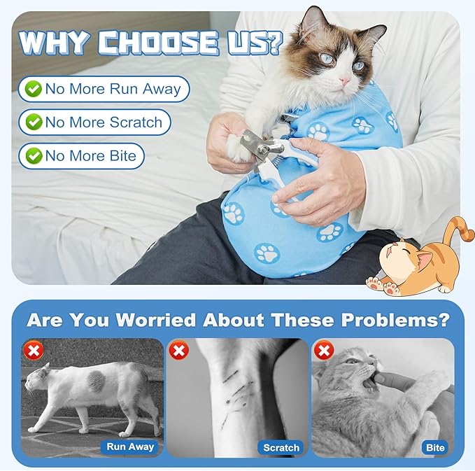 • Quick Calming Solution for Cats: Our plush cat swaddle is designed with soft, comforting material that your cat will love. It's the perfect attire for a tranquil grooming session. Simply slip it on, and watch your cat settle down quickly. Ideal for those stressful nail trimming moments, our cat wrap for cutting nails is a must-have for any cat owner.