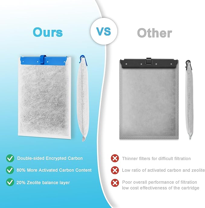 - 3 Steps for Easy Replacement:① Pre-encapsulated filter material prevents carbon leakage, say goodbye to traditional filter cartridge carbon pollution. ② Reinforced ABS frame resists deformation, fits seamlessly into Whisper filter compartment. ③ No cutting, no assembly, 30 seconds to complete the process of replacing the old with the new.