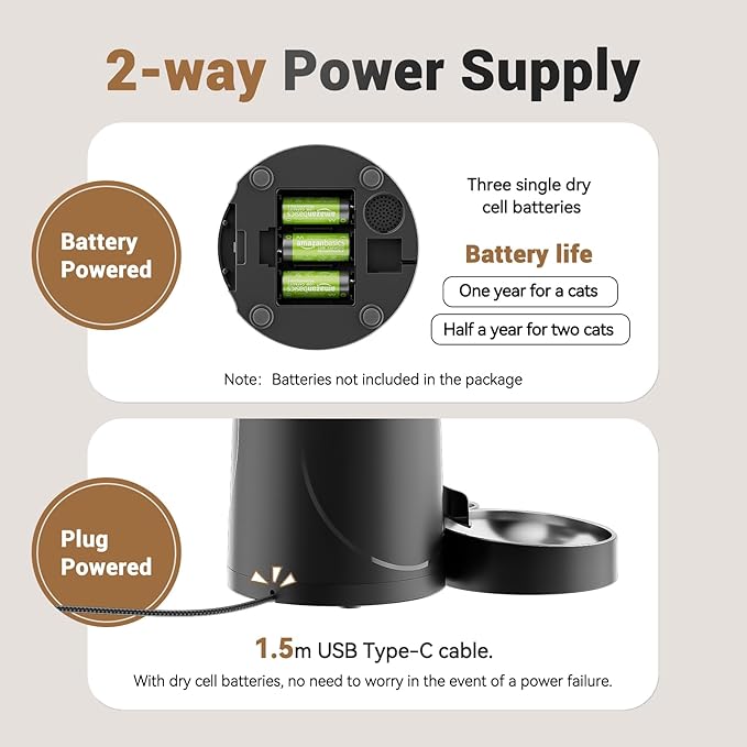 - Dual Power Supply: Never worry about power outages again. This pet feeder is equipped with a dual power supply system, and supports AC power and batteries(Not included) as backup, Even if there is a power outage, the pet feeder can still continue to work with the battery to ensure that your pets can eat on time