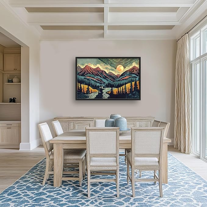 - 【Unique Design】A vintage-style illustrations of the Rocky Mountains, with pine trees and rivers flowing through them in the colors of the full moon. Mountains should be rendered in rugged detail against an atmospheric sky full of clouds. A river snakes between two rows of evergreen trees, adding depth to the scene. The emphasis in this work is on bold lines and flat face blocks. It has retro futuristic elements that give it an otherworldly character.
