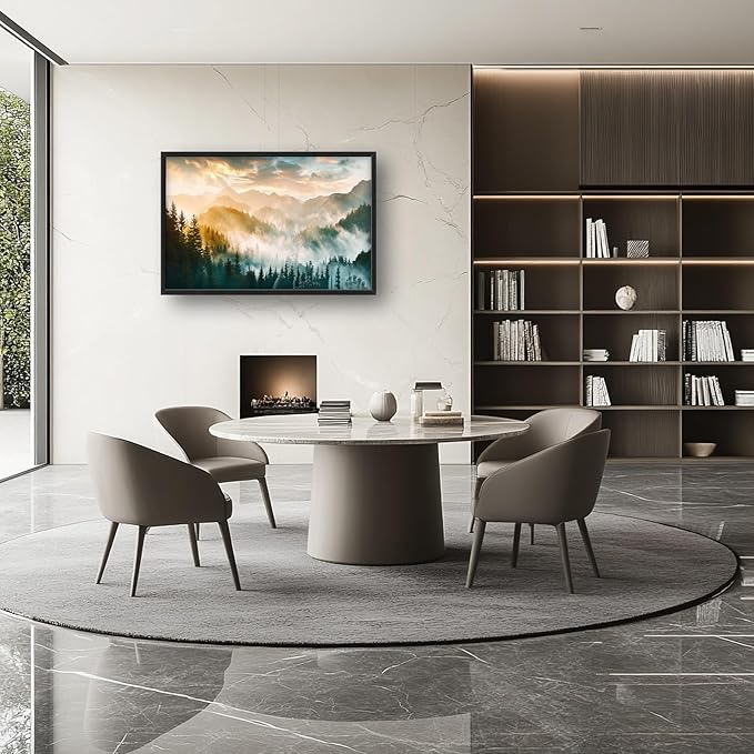 - 【Unique Design】A panoramic view of mist-covered mountains and dense forests, bathed in the soft glow of sunrise. The scene captures an enchanting atmosphere with ethereal clouds and gentle sunlight filtering through the trees.