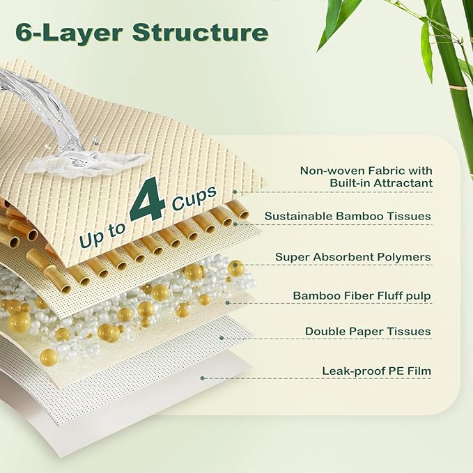 - Quick-Dry & Super Absorbent: The top non-woven fabric layer ensures quick absorption and fast drying, while the double tissue layers with super absorbent polymer lock in moisture by turning liquid into gel β allowing the pad to absorb up to 4 cups of liquid