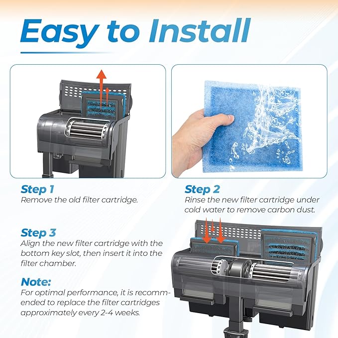 - 【EASY TO INSTALL】Before installation, please rinse the new filter cartridge c under cold water to remove carbon dust; then align the bottom key slot, insert the filter cartridges into the filter chamber. Simple and quick to install, allowing for hassle-free maintenance of your aquarium's filtration system.