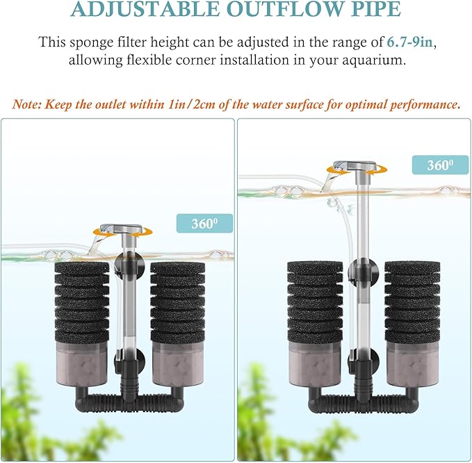 - Adjustable Filter: Easy to adjust the height of the filter with the telescopic water outlet pipe, and the direction of water outlet can be rotated by 360Β°. For different tanks, you can choose to install this fish tank filter horizontally, vertically. You can also rotate the bottom black pipe to install the filter section at different positions, which makes this bio sponge filter more convenient to use.