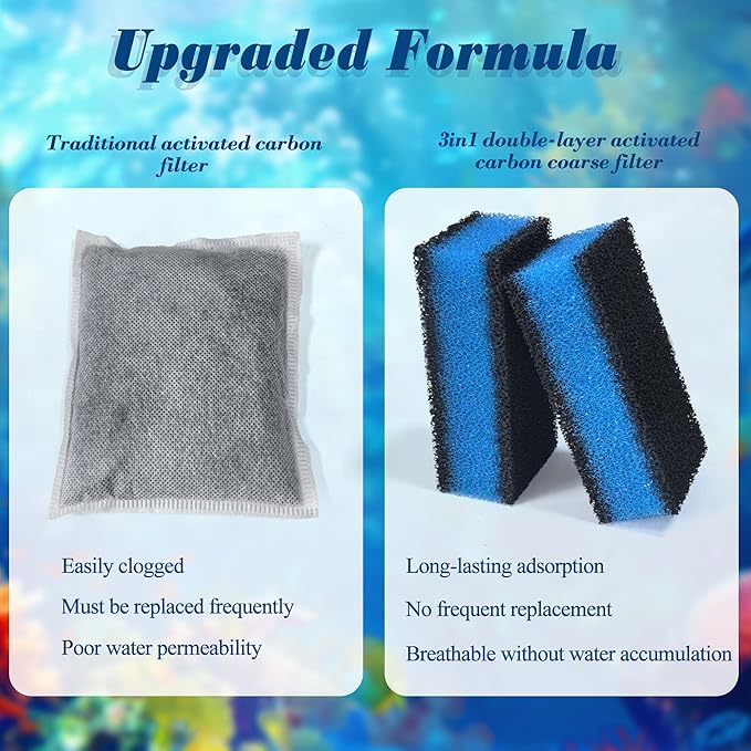 - Upgraded Formula: 3 in 1 Coarse Filter contain natural activated carbon can efficient filter water Impurities and removes odors, and improved water clarity and transparency on the time. Compared to traditional carbon filters, the 3 in 1 Coarse Filter does not block water flow and is easier to replace make it the perfect filter material