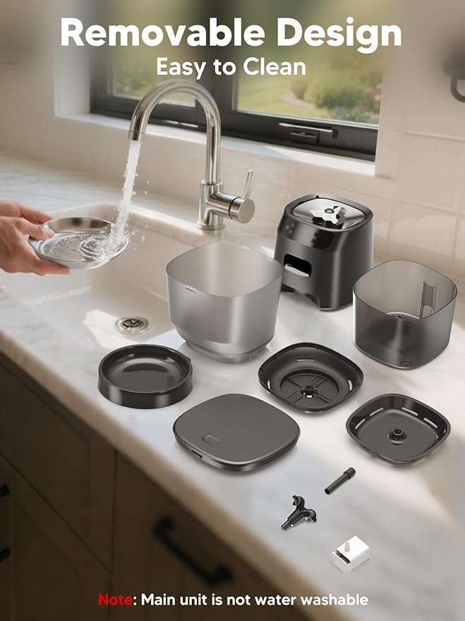- SAFE AND EASY-TO-CLEAN MATERIAL: Made from BPA, food-grade safe and reliable materials, the water dispenser is detachable for easy cleaning. The automatic cat food dispenser is equipped a hypoallergenic, odor-free stainless steel bowl, ensuring the health and safety of your pets. The water fountain and cat feeder set is perfect for cats, dogs, and all pets