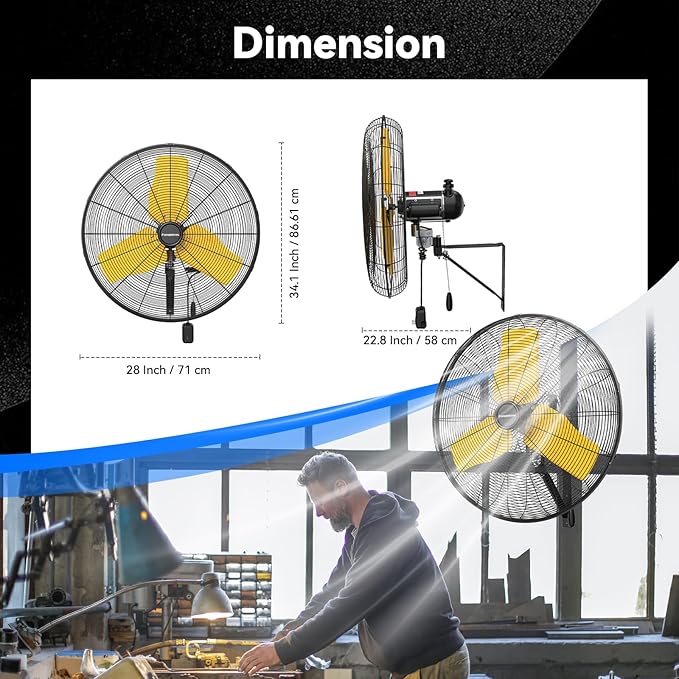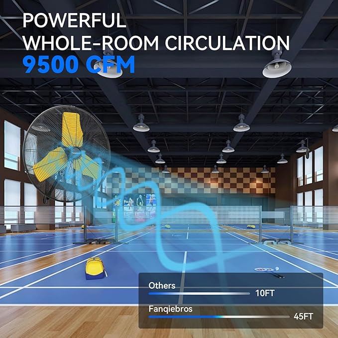 - 𝐋𝐨𝐰-𝐍𝐨𝐢𝐬𝐞 𝐃𝐞𝐬𝐢𝐠𝐧 - The heavy-duty wall fan operates at a high speed of 9500 CFM with a noise level of only 65dB, which is lower than the industry standard, creating a quieter gathering or working environment