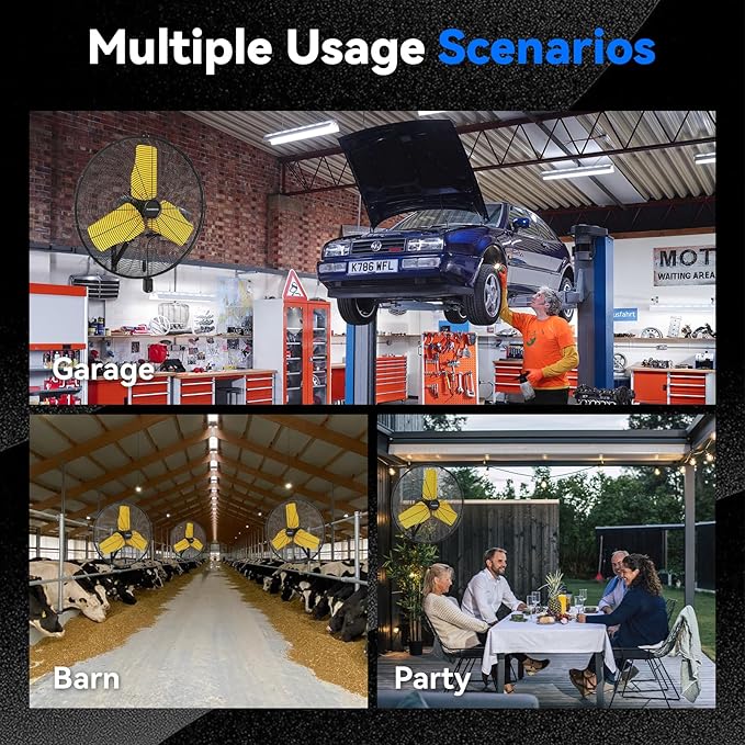 - 𝐇𝐢𝐠𝐡 𝐕𝐞𝐥𝐨𝐜𝐢𝐭𝐲 𝐀𝐢𝐫 𝐅𝐥𝐨𝐰 - The oscillating wall fan zipper design makes the operation more intuitive and simple, and can be adjusted from high, medium and low speeds by zipper to meet different needs. High speed 9500 CFM, medium speed 8000 CFM, low speed 7200 CFM, providing hurricane-like airflow to meet your garages, shops, covered patios, or anywhere else you need