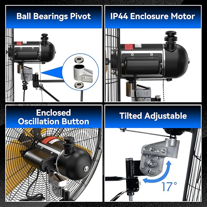 - 𝐇𝐞𝐚𝐯𝐲-𝐃𝐮𝐭𝐲 𝐒𝐭𝐫𝐮𝐜𝐭𝐮𝐫𝐞 - Oscillating fan is sturdy and durable. OSHA compliant grille ensures safety, powder coating for excellent corrosion resistance, ball bearing pivot, equipped with wall mount, metal gear and aluminum blades enhance wind output. Rust-resistant grille ensures long-term safe and worry-free use while easy to clean and maintain.Extra long 6 feet + SIT waterproof power cord, 1/10 HP, 120V, 220 Watts, 60 Hz. UL safety certification