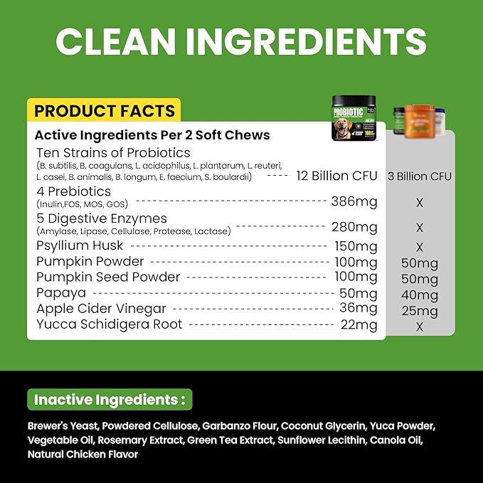 - 【Clean & Natural Ingredients】Our dog probiotics made with pumpkin, papaya, apple cider vinegar, and psyllium husk. No artificial flavors, soy, corn, or fillers. Gentle formula with no known side effects. Soft chews dogs love, perfect for pets with yeast infections or sensitive skin.