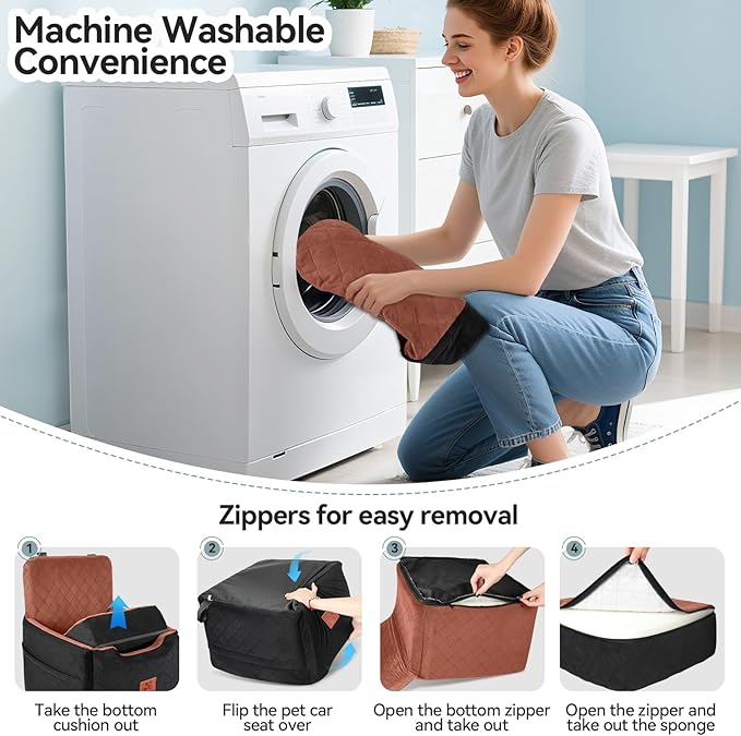 - Detachable and Washable:This pet car seat is very easy to clean,with its fully detachable design.The dog bed has a built-in sliding zipper, just remove all the foam, and then machine wash the seat covers.The bottom of the booster seat is waterproof, protection against accidents. Please note that the inner foam is not washable.