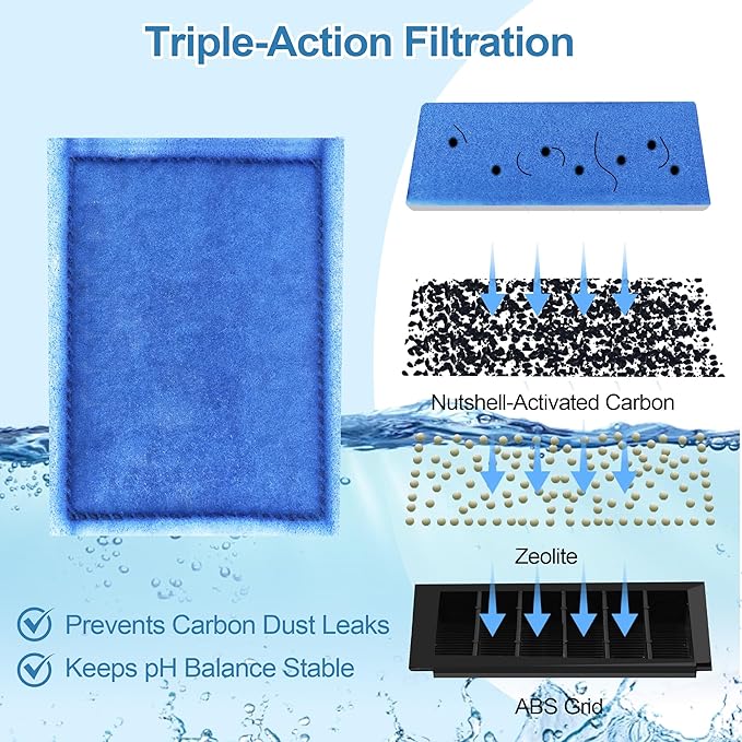 - Premium Water Filtration - Triple-action filtration for a pristine aquarium.The high-quality mesh layer traps debris, fish waste, and other particles, ensuring crystal-clear water and a healthy, thriving aquarium for your fish to flourish in. ABS grid design prevents carbon dust leakage, ensuring your activated carbon stays fully effective and that your tank water remains free of contaminants.