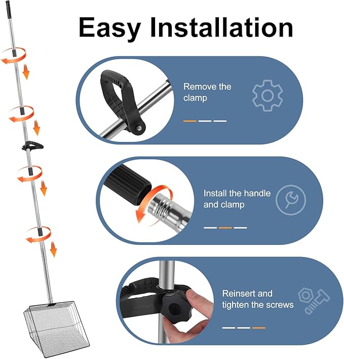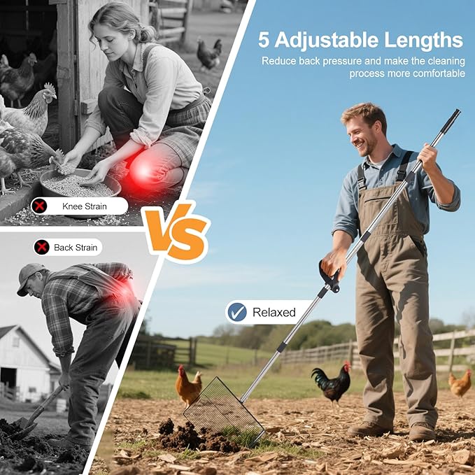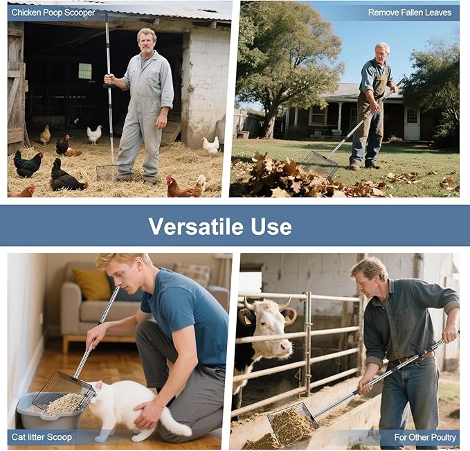 - Effortless Cleanup with Ergonomic Design – Say goodbye to bending and straining your back during cleaning. This chicken poop scooper comes with an extended 76" handle that allows you to comfortably scoop waste without needing to bend over. Perfect for people with back issues or anyone looking to make chicken coop maintenance less physically demanding. Enjoy the convenience of cleaning while standing with no more back pain or fatigue.