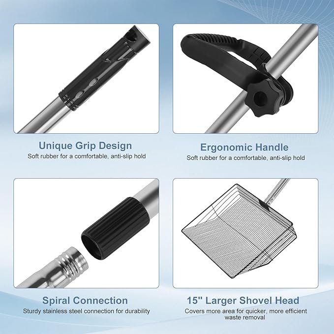 - 【15in Extra-Wide Stainless Steel Scoop】: Crafted with a durable stainless steel head and a rust-resistant finish, our wide shovel covers more ground with each pass and maximizes productivity while minimizing repetitive motions.Ideal for cleaning large chicken coops, goat pens, and even horse stalls.