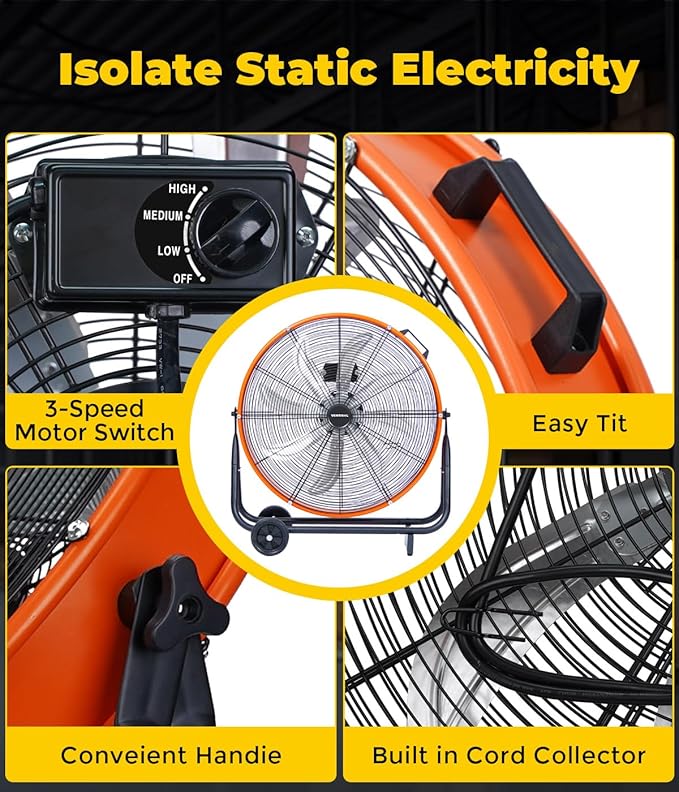- VENTISOL floor standing industrial fan with 360° swivel function and tilt adjustable design, allowing you to direct the airflow in multiple directions over a wide space. Ventisol 24 inch drum fan for garage, with a thermally protected motor, automatic shut-off feature prevents overheating for safety. Extra-long 5.4ft power cord for long lasting use.