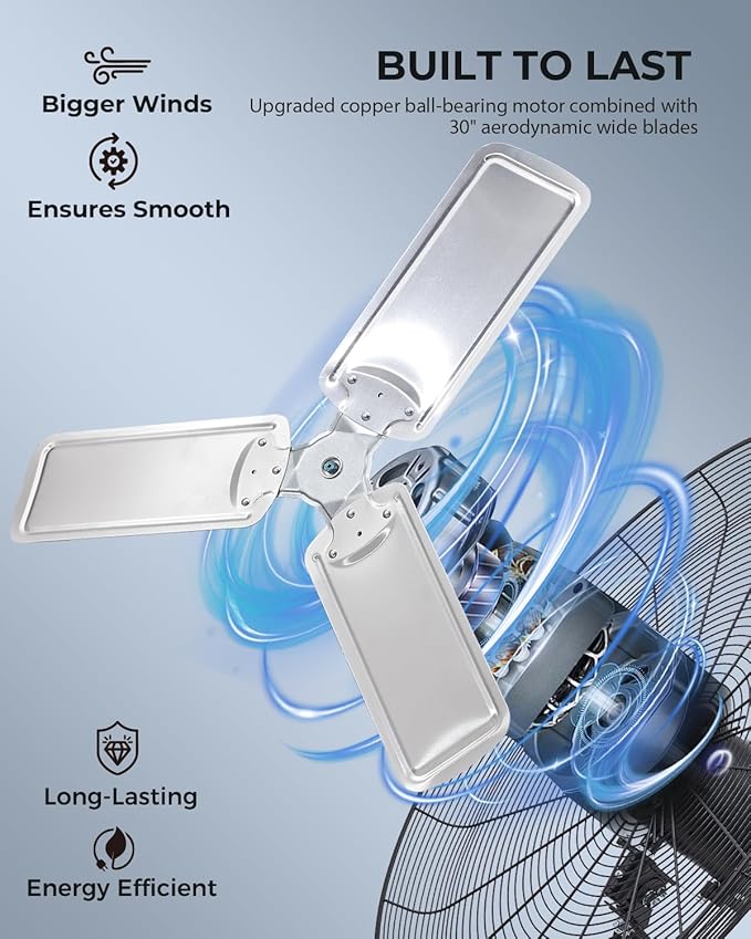 - Easy to Assemble & Use: 30 inch heavy duty oscillating fan included wall mounting hardware for a fast install on concrete walls. Just drill, mount the bracket, attach the blades and grille, and enjoy cooling in under 5 minutes!