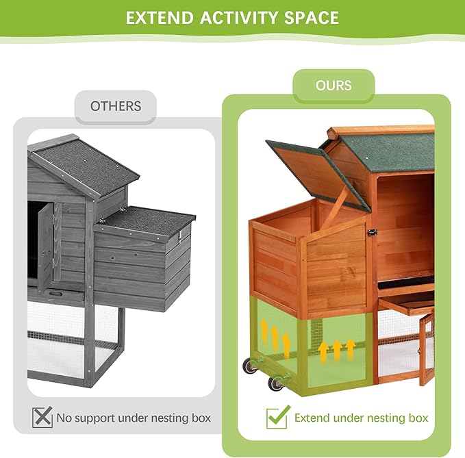 - 【Chicken Coop with Ample Space】: Measuring 82.29 inches in total length, this chicken coop provides chickens with a spacious living area and run area on the ride side for free roaming and exercise freely, suitable for 2 adult chickens or other similar sized pets.
