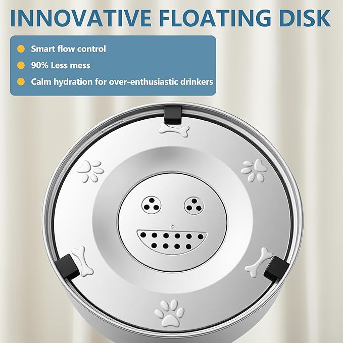 - One-Piece Floating Disk: The dog water bowl goes with a innovative floating disk to slow down water drinking, also helps keep dust, dirt, and pet hair from falling into the water, ensuring fresh and clean drinking water for your pet