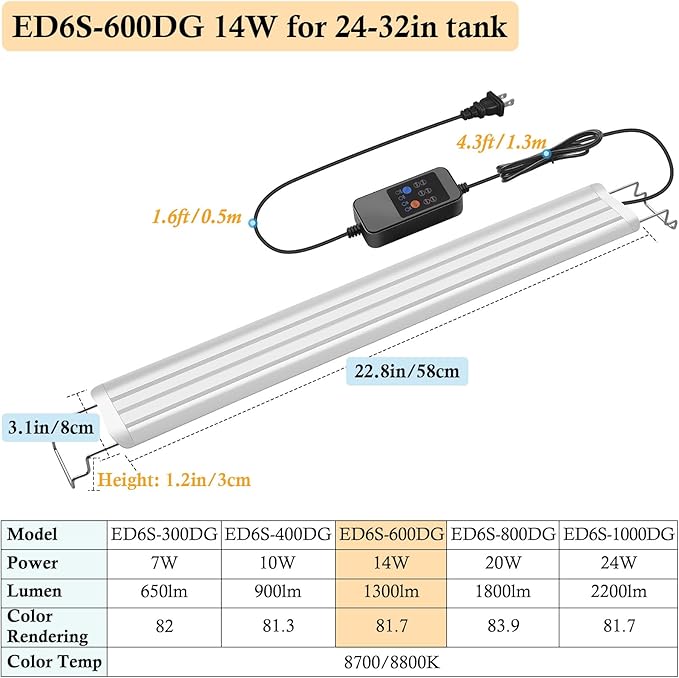 - HITOP 14W 24in Full Spectrum Aquarium LED Light for 24-32in fish tank, 6Ft Long Cable. High Lumens: 1300lm, CRI: 81.7, Color Temperature: 8700K. With RGBW 4 colors LED Beads, this fish tank light simulates natural white light to showcase the truest colors of your aquarium and plants, with adjustable brightness.