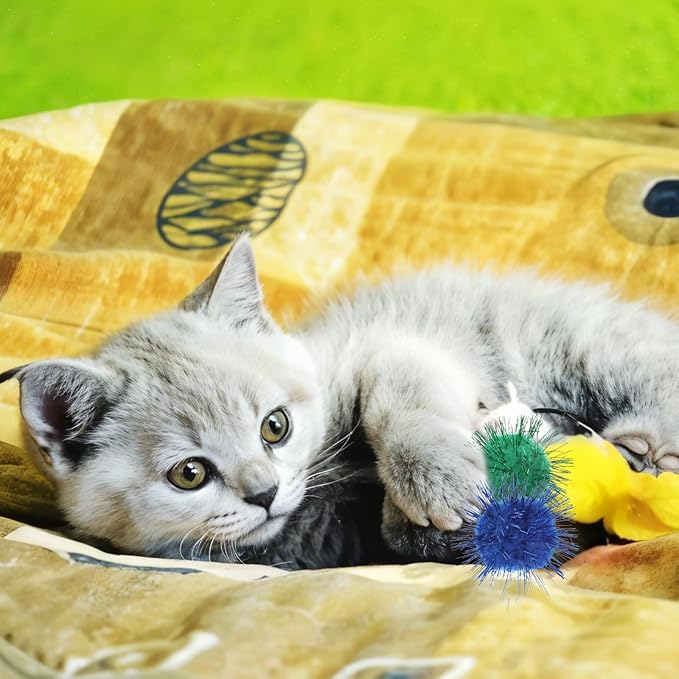 - Attractive Design: Pom poms come in a variety of bright and eye-catching colors combined with sparkly elements that are sure to inspire your cat’s natural curiosity and hunting instincts, making them irresistible to chase, pounce and play, helping them burn off excess energy.