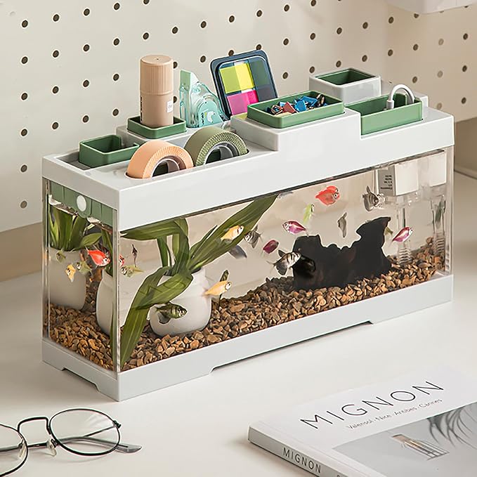 - 【Versatile Use】The top cover has multiple storage compartments, which can be used to store daily necessities, keeping the countertop clean and tidy. The fish tank also comes with three charging ports, making the fish tank convenient to power water pumps or provide emergency charging for digital products.