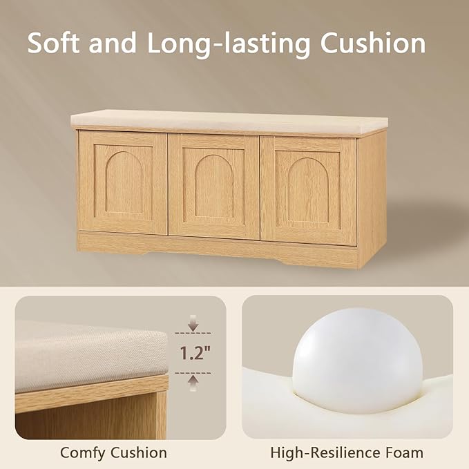 - 【Effortless Push-to-open Door】Feature a fully enclosed design with a press-to-open mechanism, keeping shoes clean and tidy while avoiding accidental bumps against door handles during use. Reasonable height and soft cushion let you change shoes by sitting on the bench more comfortable without bending down or squatting