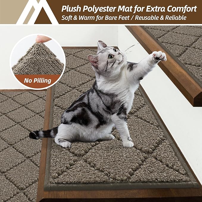 - Thick and Comfortable:Crafted from wear-resistant Polyester fibers,the non-slip stair treads offers exceptional durability and a soft feel underfoot with fine stitching and edge-locking technology.The stair carpet treads is designed to withstand daily use without pulling or piling up,ensuring long-lasting comfort and protection for your family.The ideal thickness helps in noise reduction and keeps your feet warm against cold stairs,providing a cozy living environment