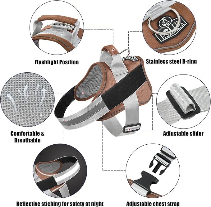 - OUTDOOR HEALTHY: Puppy no pull dog harness with reflective straps to ensure your dog is highly visible and keep dogs safe at night. You can connect the dog leash on the D-ring and with handle is easy to control on crowded streets. The high-end pet harness is perfect for daily walking, running, hiking, training, hunting, outdoor adventure and more!