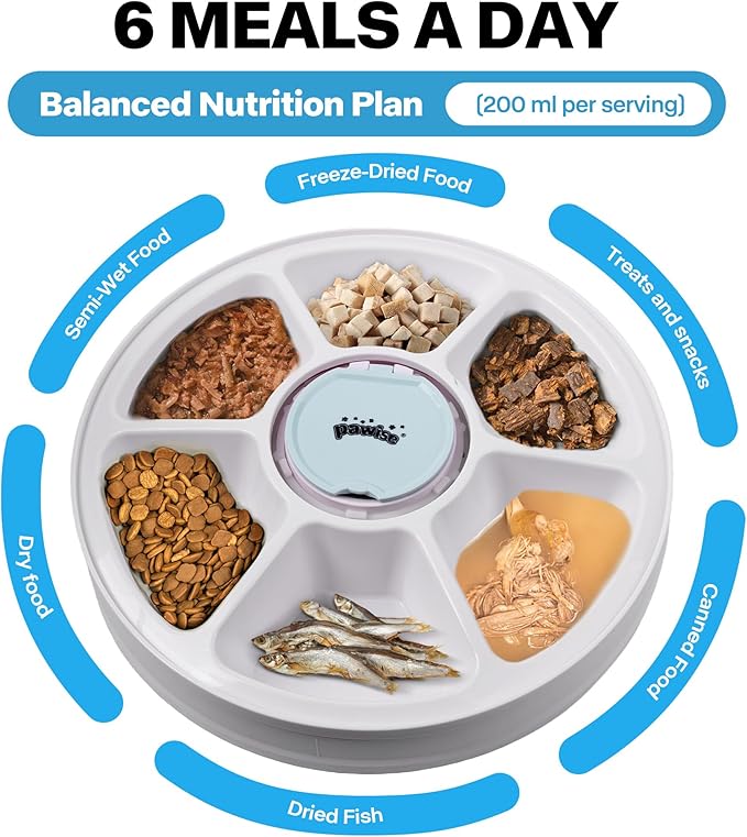 - ⏰ 6-Meal Automatic Feeder – Easily schedule up to 6 meals per day using the built-in electronic timer. Each compartment holds up to 1 cup of food, perfect for portion control, dietary plans, and maintaining a healthy routine for cats or small dogs. This automatic feeding system ensures your pet is fed on time, every time.