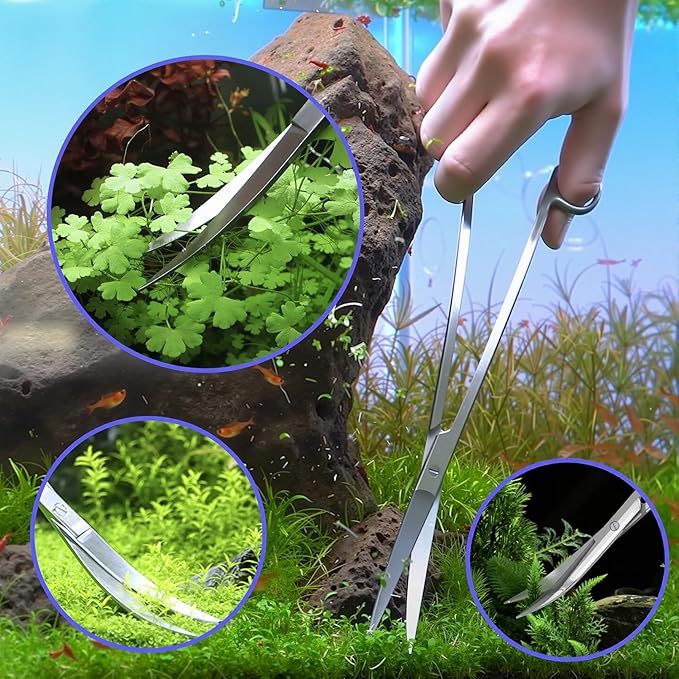 - 【PRECISION AQUASCAPING TOOLS】: 9.84" STRAIGHT TONGS plant stem vegetation in tight spaces. 9.84" CURVED TONGS position carpeting grasses in unreachable corners - both eliminate hand submersion. 8.7" CURVED SCISSORS trim mosses/prune thick plants (e.g., Anubias/Hygrophila) without disturbing substrate.