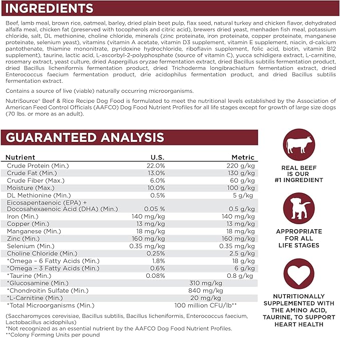 - As a member of our grain inclusive series, NutriSource Beef and Rice Dry Dog Food is formulated to meet AAFCO guidelines for all lifestages