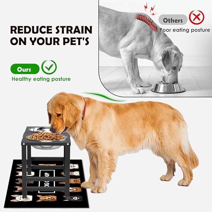 - 【Keep Your Floor Clean】The ADENGL raised dog bowl comes with a cute splash-proof mat that can be placed underneath the bowl rack, spilled food and water can be well collected by the mat to keep the feeding area dry and tidy