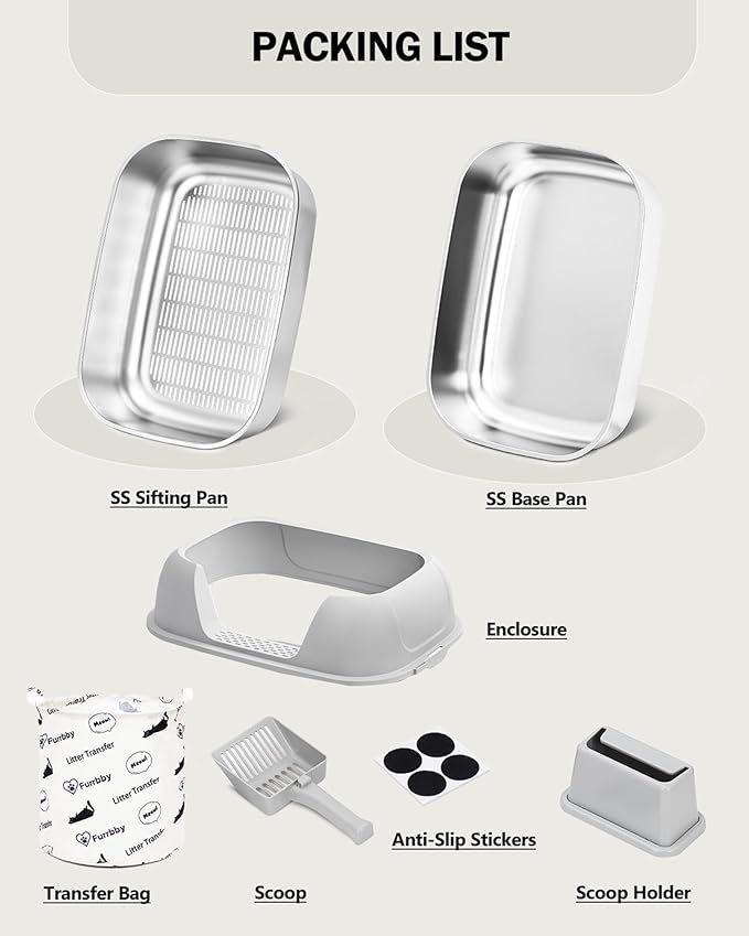 - COMPLETE SET: The package comes with a cat litter scoop, holder, enclosure, litter recovery platform, anti-slip stickers, and transfer bag. Moreover, this steel cat litter box is compatible with clumping cat litter and clay litter