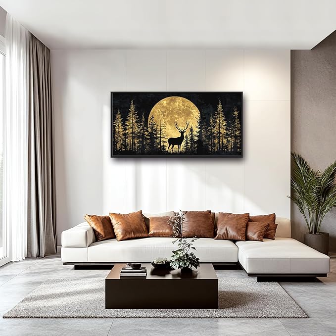 Large Moon Deer Forest Wall Art for Living Room, Black Gold Canvas Oversized Wall Decor, Elk Animal Framed Pictures Painting Print Artwork for Bedroom Office 60L" x 30W"