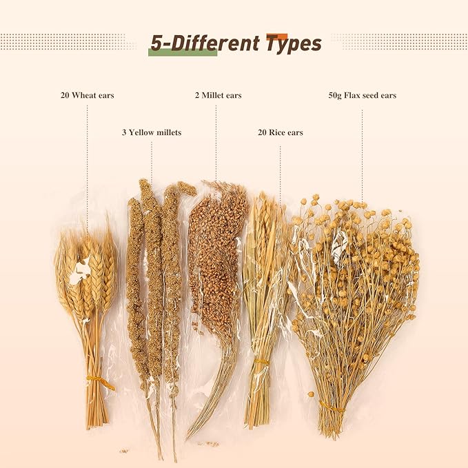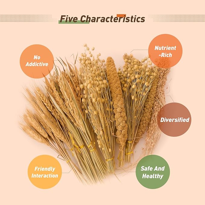 - Abundant Variety & Great Value: Enjoy large quantities at an affordable price. Features rich mixes: the 5-type blend includes rice ears, wheat ears, flax seed ears, yellow millets, and millet ears; the 7-type blend adds red and white sorghum for endless enrichment.