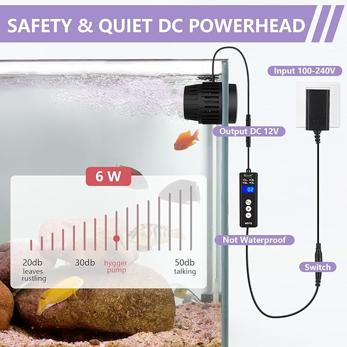 - Safety DC PumpοΌWith a DC 12V 6W powerhead, the max flow rate up to 792 GPH, it provides plenty of flow while remaining quiet. Also comes with a hard cover for the intake to prevent small fish and anemones from getting sucked in