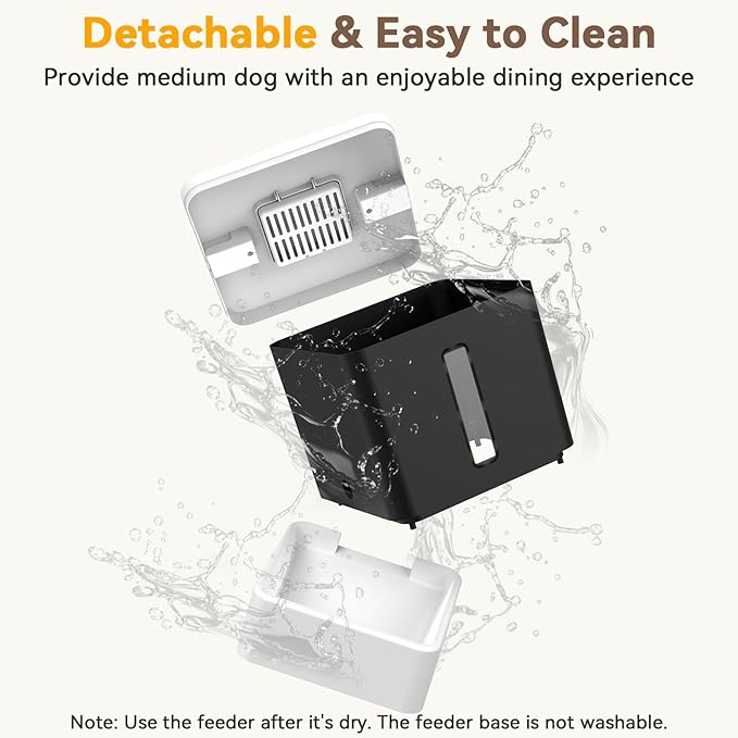 - Quick Setup & Cleaning - The dog food dispenser automatic installs in 1 minute, with detachable tray and tank for easy cleaning and hygienic feeding.