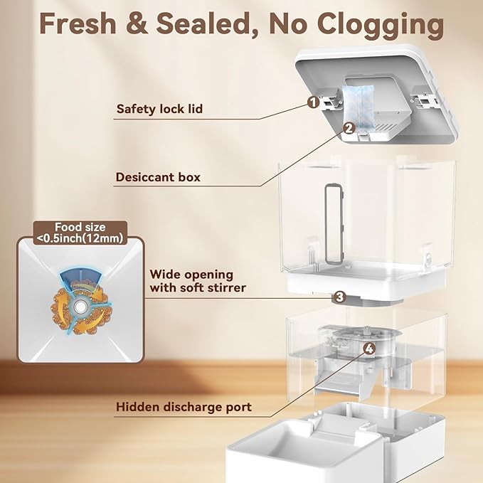 - Secure Anti-Tip Design - Our dog automatic feeders feature a locking lid and stable base to prevent spills or tampering by curious dogs or cats.