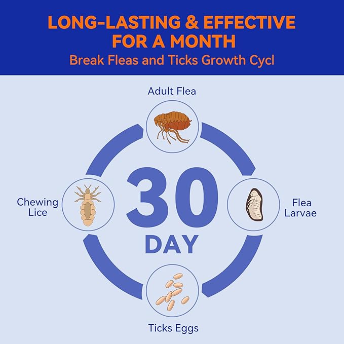 - Trusted, Vet Quality Formula: Our dog flea and tick treatment drops feature feature Powerful Fipronil+(S)-Methoprene Formula, which disrupts the nervous systems of fleas and ticks. This advanced ingredient ensures our flea treatment for dogs is both fast-acting and long-lasting, providing reliable protection.