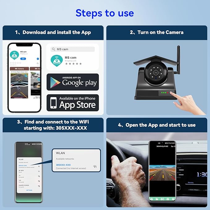 - Stable signal transmission and IP68 Waterproof: By adopting the upgraded wireless module and chip, also having 2.4GHz WiFi transmission speed, the wifi backup camera for trailer transmits signals more stably with no freeze, and over longer distances up to 328ft in open spaces or 33ft in the presence of obstacles. Passed IP68 waterproof test, the camera for trucks can work in all weather conditions.