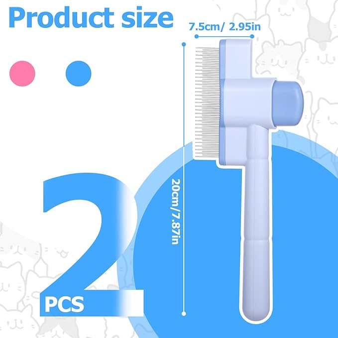 Zen Brush for Cats: Cat Flea Comb & Dematting Comb for Cats - Self-Cleaning Pet Hair Removal Tool with Long & Short Stainless Steel Teeth, Blue Pink