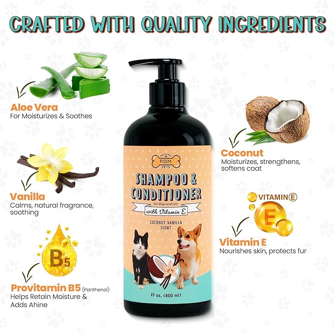 - "EASY 2-IN-1 GROOMING FOR DOGS & CATS: Simplify bath time with this convenient dog shampoo, combining cleaning and conditioning in one effective step. Perfect for busy pet parents, It works as both dog shampoo and conditioner as well as organic cat shampoo and conditioner, making it great for both dogs and cats care."
