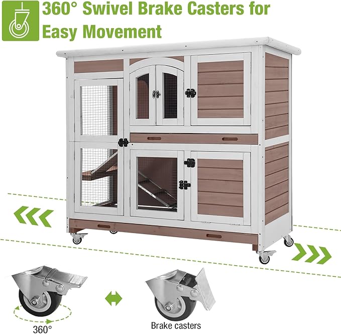 - Mobile Rabbit Hutch with Secure Casters: Four smooth-rolling casters allow easy relocation of the bunny hutch, with two lockable brakes ensuring stability and safety on any surface.