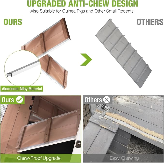 - Reinforced Chew-Resistant Design: The access ramp features aluminum alloy-reinforced edges to discourage chewing by rabbits and other small pets, enhancing the hutch’s long-term durability. This sturdy design protects against wear and tear, ensuring lasting use.